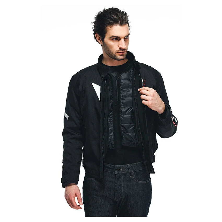 Composite protectors on the shoulders and elbows uphold Dainese safety standards and can be upgraded with a G1 or G2 back protector (sold separately). The jacket is also equipped with a zipper safety system for attachment to Dainese motorcycle pants. Reflective details ensure perfect visibility on the road. It also offers ample storage space with two external side pockets with a zipper, a zippered pocket on the chest, and two inside pockets.