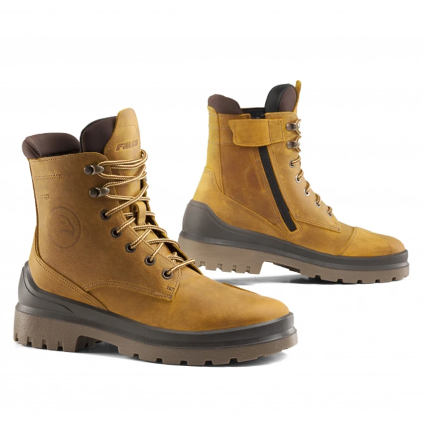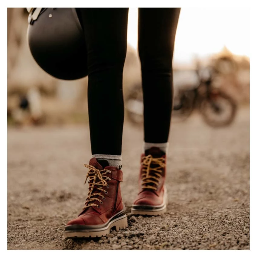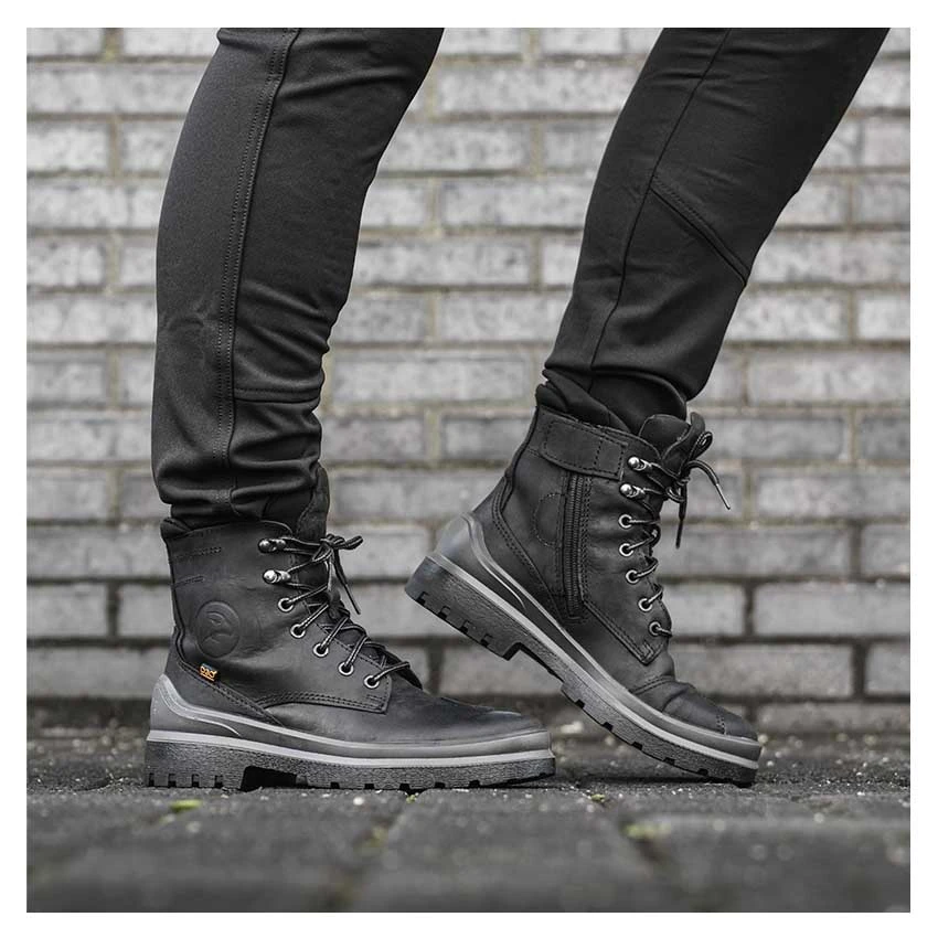 Tough ladies motorcycle shoe with laces and zipper for easy entry. Equipped with High-tex membrane resistant to water penetration. D3O reinforced ankle cups and dual compound vulcanized rubber sole.