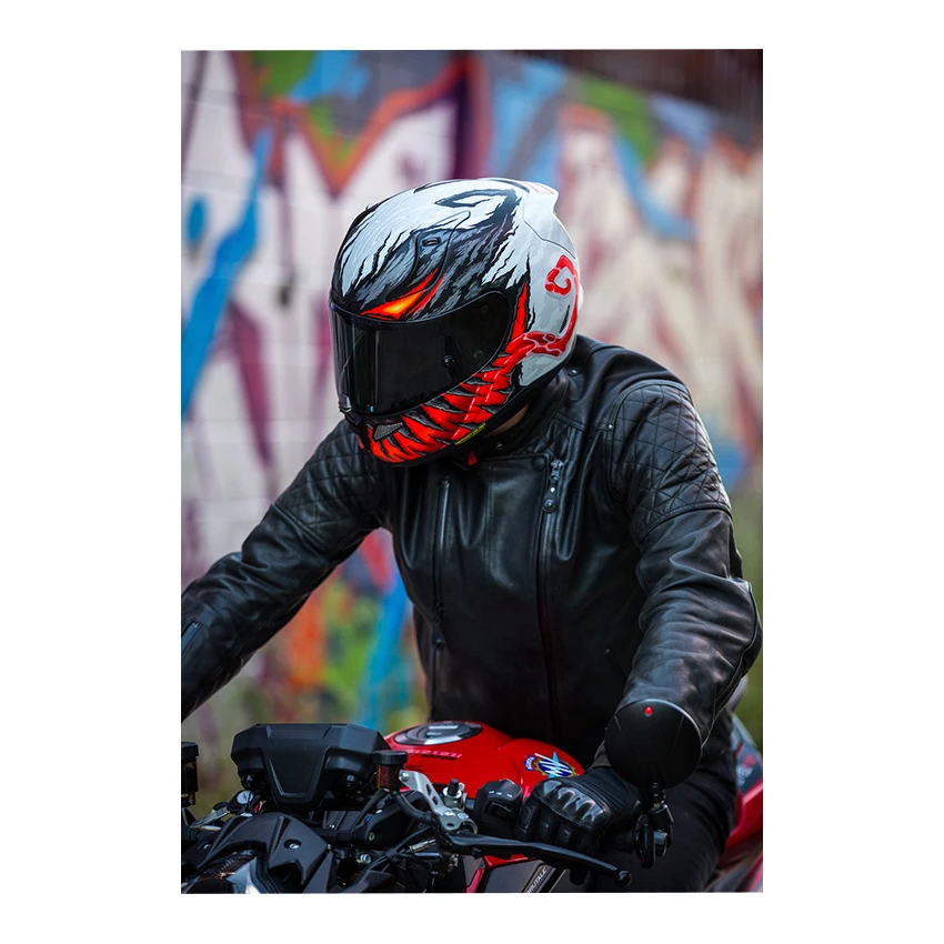 The HJC Rpha 11 Anti Venom (MC-1SF) graphic is part of the Marvel/HJC series. The RPHA 11 is designed for the racetrack with an aerodynamic shell structure composed of HJC’s Premium Integrated Matrix (P.I.M. Plus) shell material for enhanced shock-resistance in a lightweight helmet. The features cater to sport riders with an enlarged eye port for an increased view in a tucked position and an outstanding airflow ventilation system. Additional safety features include reflective patches on the rear neck area and an emergency release cheek pad system for safe and quick helmet removal in an emergency situation.