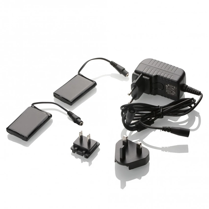 Klan-e battery kit for gloves and socks, consisting of a 7.4 volt battery and a charger capable of charging each battery with a current of 2000 mA. Each battery is made up of one separate cells measuring 40 x 60 x 10 mm each and a weight of 110 g.