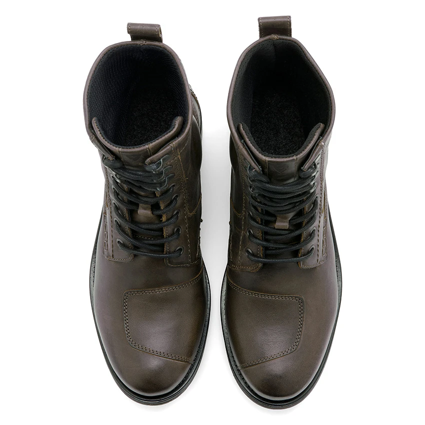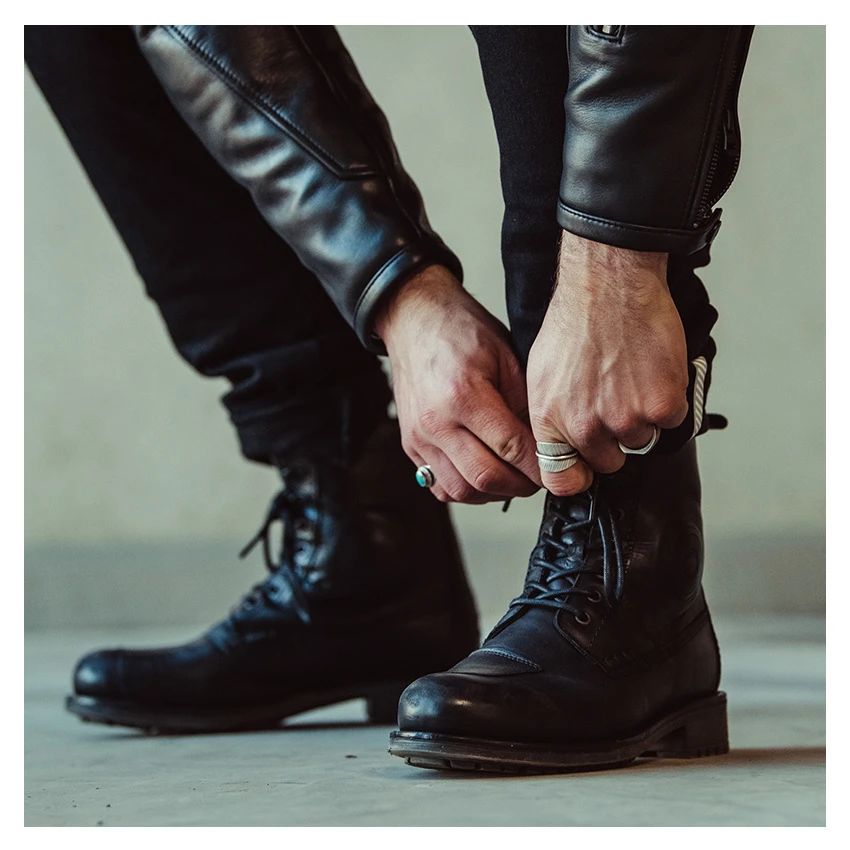 The Portland motorcycle shoes are high-quality leather boots with a sturdy appearance. They pair perfectly with your protective riding jeans and a leather jacket yet don’t take away from your fashionable looks when walking the streets. These shoes take you back to the future; combining styling from the past (archetype inspired “worker boots”) with tomorrow’s protection. Hand-stitched details and a small reflective piece at the heel show that traditional styling and modern details go hand-in-hand when creating your next favourite pair of shoes. And to make them ride-ready, we’ve included a leather shift pad when you’re taking on the urban jungle. Reinforced heel and toe cups and thermoformed cups on both sides of the ankle ensure protection is incorporated invisibly to offer protection that is up to the CE requirements. A true boot in appearance, the Portland are as tough as Urban motorcycle shoes get without becoming uncomfortable thanks to the OrthoLite® insole.
