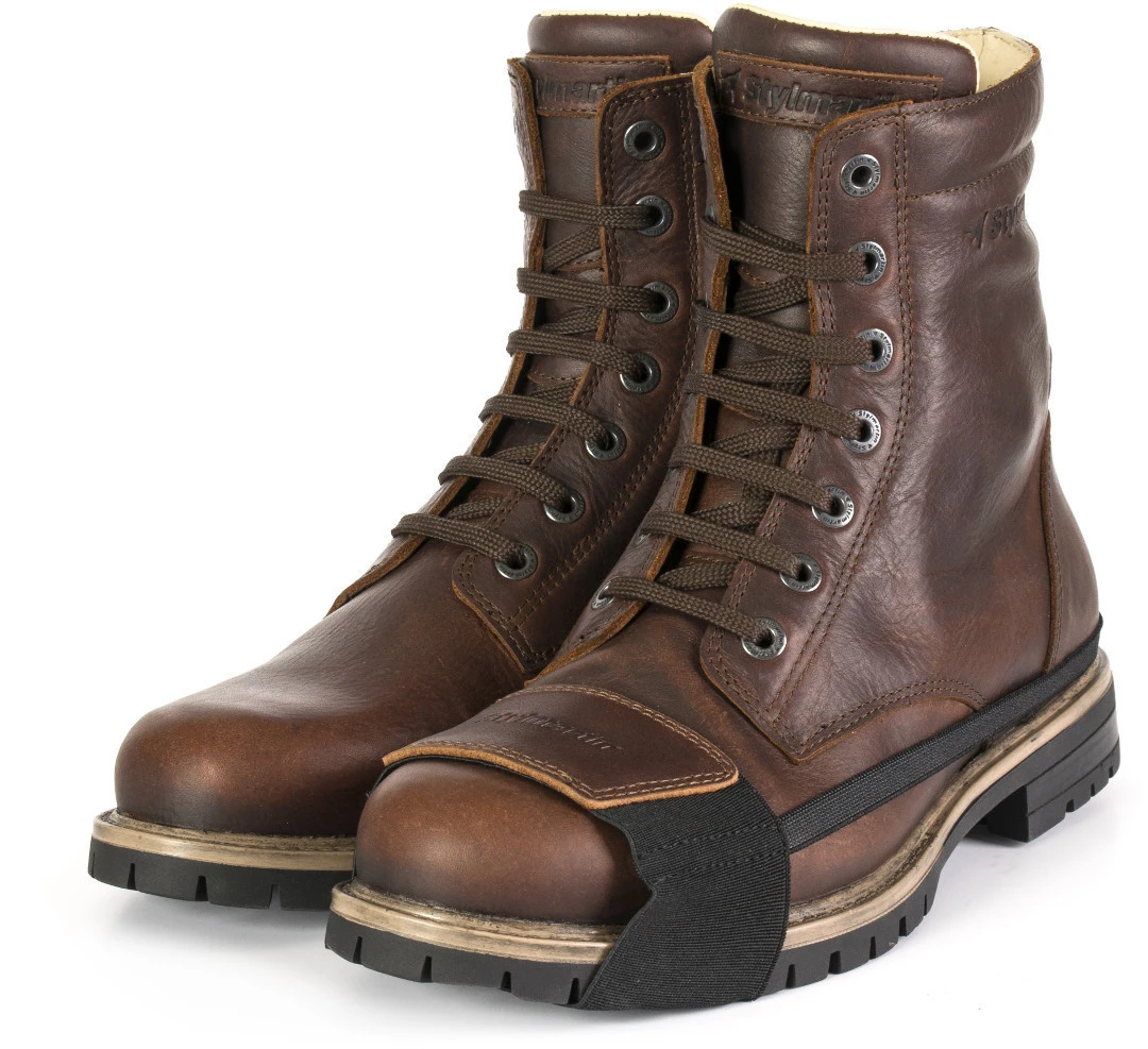 Café racer boots also intended for urban use, due to their simplicity of line and the use of natural full grain leather only choice as valuable pieces, characterized by particular details and protections that ensure safety even for daily use, sold with shifter removable elastic gear protection. In full grain natural leather with breathable lining with malleolus protections. Anatomic and antibacterial footbed.